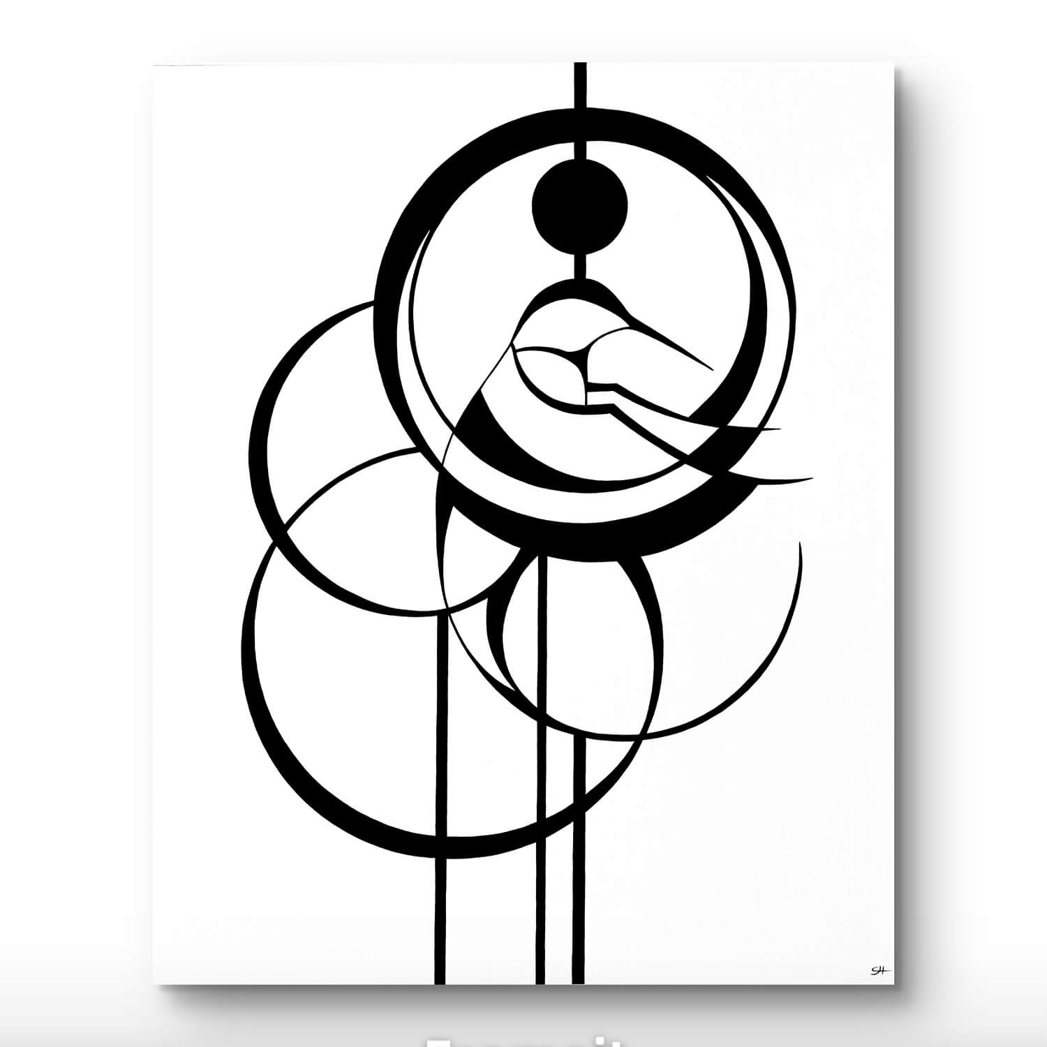 J'ai représenté l’élévation par un trait au-dessus de la tête de l'oiseau, ce trait c'est un fil divin qui nous relie à tout, à l'univers, à Dieu, à la source. Le rond noir au-dessus de la tête de l'oiseau est une symbolique de l’équilibre parfait, l’équilibre divin. Le grand cercle autour de la tête de l'oiseau représente son aura, les deux autres cercles représentent ses vies antérieures et le cercle qui est en train de se terminer représente le fait que cette âme a désormais terminé son parcours terrestre. Les trois autres traits sont très importants puisqu'ils constituent aussi l'histoire de cette peinture.